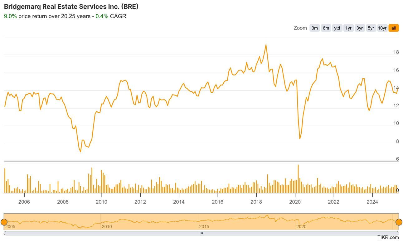 Bridgemarq was originally called Brookfield Real Estate Services after Cushman and Wakefield acquired the Royal LePage brand all the way back in 2005. It was almost immediately spun out and listed on the TSX as an income trust (remember those?), and the stock hasn’t done much of anything since. Shares cratered during the 2008-09 and 2020 bear markets, but only temporarily. Besides those two big moves, the stock has pretty much traded between $12 and $18 for 20 years.