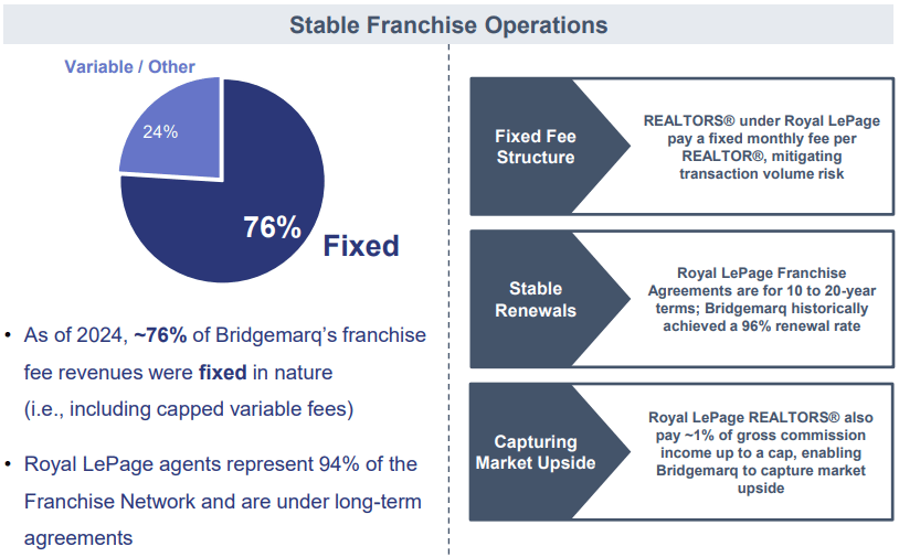 For years Bridgemarq quietly existed, operating an asset-lite business model. Rather than owning the brokerages directly, the company owned the trademarks. Fees were originally collected on a per-transaction basis, with the agent paying the parent every time they made a transaction. Those per-transaction fees still exist today, but the company has pivoted to a monthly fee model. Essentially, they want to get paid whether a Realtor sells a place or not, which does create a little more certainty.