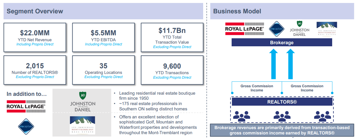 Like a lot of transactions, this one has both pros and cons. On the plus side, this gives the company the platform needed to start rolling up brokerages across Canada. It gives potential exit liquidity for current franchisees, and prices to acquire them should be relatively attractive. The real estate brokerage model is also pretty good, although it does suffer from some cyclicality. The parent was able to protect itself from real estate busts by getting more monthly fees from agents. Brokerages, meanwhile, are much more dependent on sales.