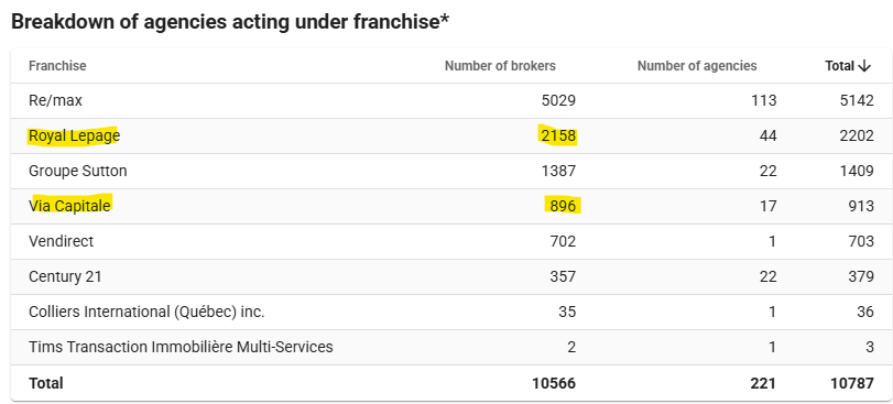 Royal LePage is strong pretty much across the country, and is even respectable in Quebec. When you combine its exposure in La Belle Province with Via Capitale — who is a formidable player itself — and fellow Bridgemarq brand Proprio Direct, they rival Re/max as the largest player in the province.