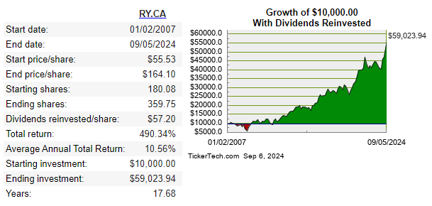 Dividend growers like Royal Bank — or dozens of others on the TSX, and hundreds more in the U.S. markets — which offer decent starting yields and steady potential growth can combine to deliver surprisingly solid returns. Especially if you reinvest your dividends.