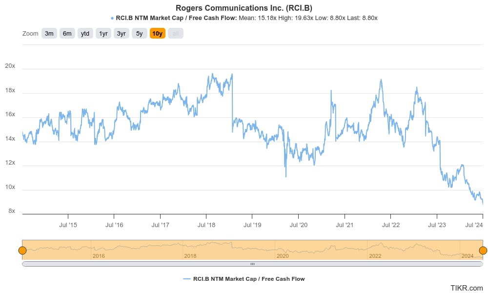 As it stands today, Rogers trades for just under $50 per share. It continues to tell investors to expect about $3B in free cash flow in 2024, which works out to approximately $5.75 per share. That puts the stock at 9x free cash flow, with expectations free cash flow will go up in 2025 and 2026 as the company pays down debt.