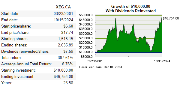 Canada’s largest energy ETF, the iShares Capped Energy ETF (TSX:XEG) has returned less than 7% per year since its inception in 2001, and most of that return has come over the last few years as oil has come back into fashion again. From 2001 through 2020 it was pretty much flat, and that’s even including reinvested dividends.