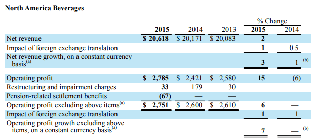 To demonstrate, let's take a closer look at 2015's results. In that year, the North American beverage division generated $2.75B in operating profits. That number was slightly higher than results in 2014 and 2013, which both saw operating profits in the $2.6B range.