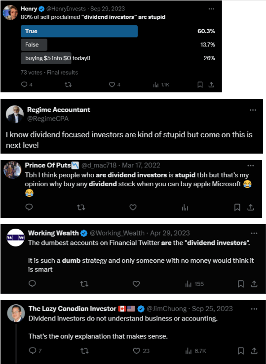 Dividend haters moved off the Seeking Alpha comment section and onto the ol’ Tweeter app, and they were everywhere. A small sampling: