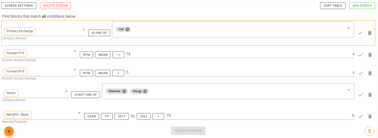 The first criteria is easy. We’re limiting the search to TSX stocks. You can choose to put a market cap requirement on it if you want, but I didn’t want to exclude smaller stocks just because of their size.