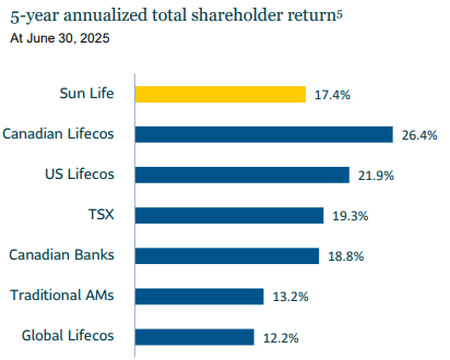 It's been a winning formula. Sun Life posted a five-year annualized total return of 17.4% through June 30th, 2025. Although this lagged its insurance peers in Canada and the United States, the company did beat its global peers. Besides, a 17% annualized return is a pretty solid result. Imagine being unhappy with it.