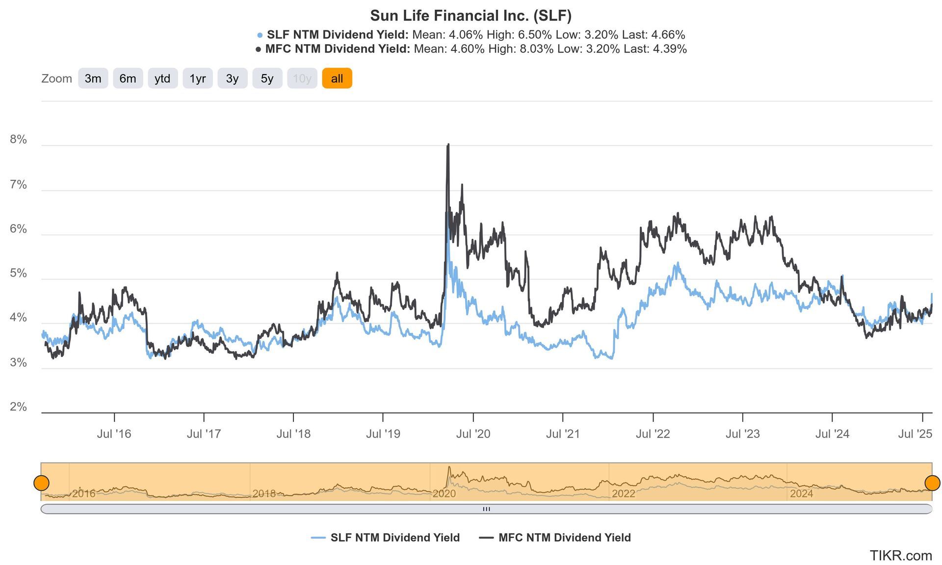 (In an interesting twist, Sun Life now yields more than Manulife. That’s a relatively rare phenomenon in the last decade. In fact, it really only happened in the latter part of 2017 and for a couple of months in 2024)