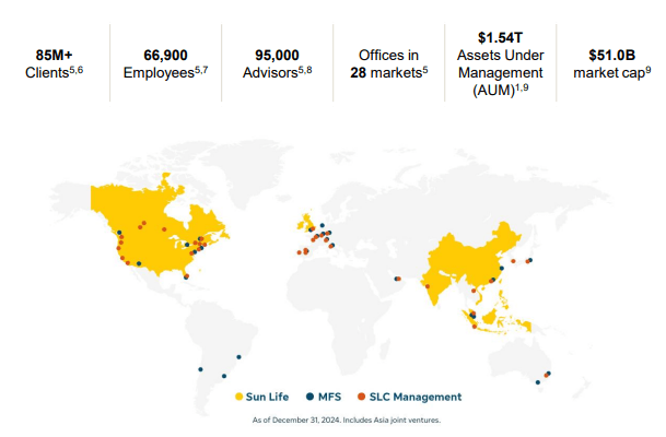 It has more than 85M clients around the world with more than 66,000 employees and some 95,000 advisors selling various Sun Life products. It has more than $1.5T in assets under management with offices in 28 different markets. Put simply, it is a financial services behemoth.