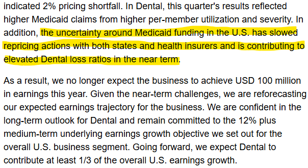 We'll note that the company remains committed to 12%+ annual earnings growth from its U.S. business, even considering this latest issue with dental. It isn't just a dental insurer in the U.S., it also provides stop-loss health insurance, and group life/disability insurance for some 9M Americans. It also has a large annuity business in the U.S. There's only one part of a larger business that's having problems here — the rest is tickety boo.