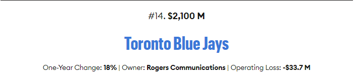 For the Blue Jays, we’ll just use Forbes’ valuation, which says the franchise is worth US$2.1B. That’s probably a little bit light, but we’ll be conservative here.